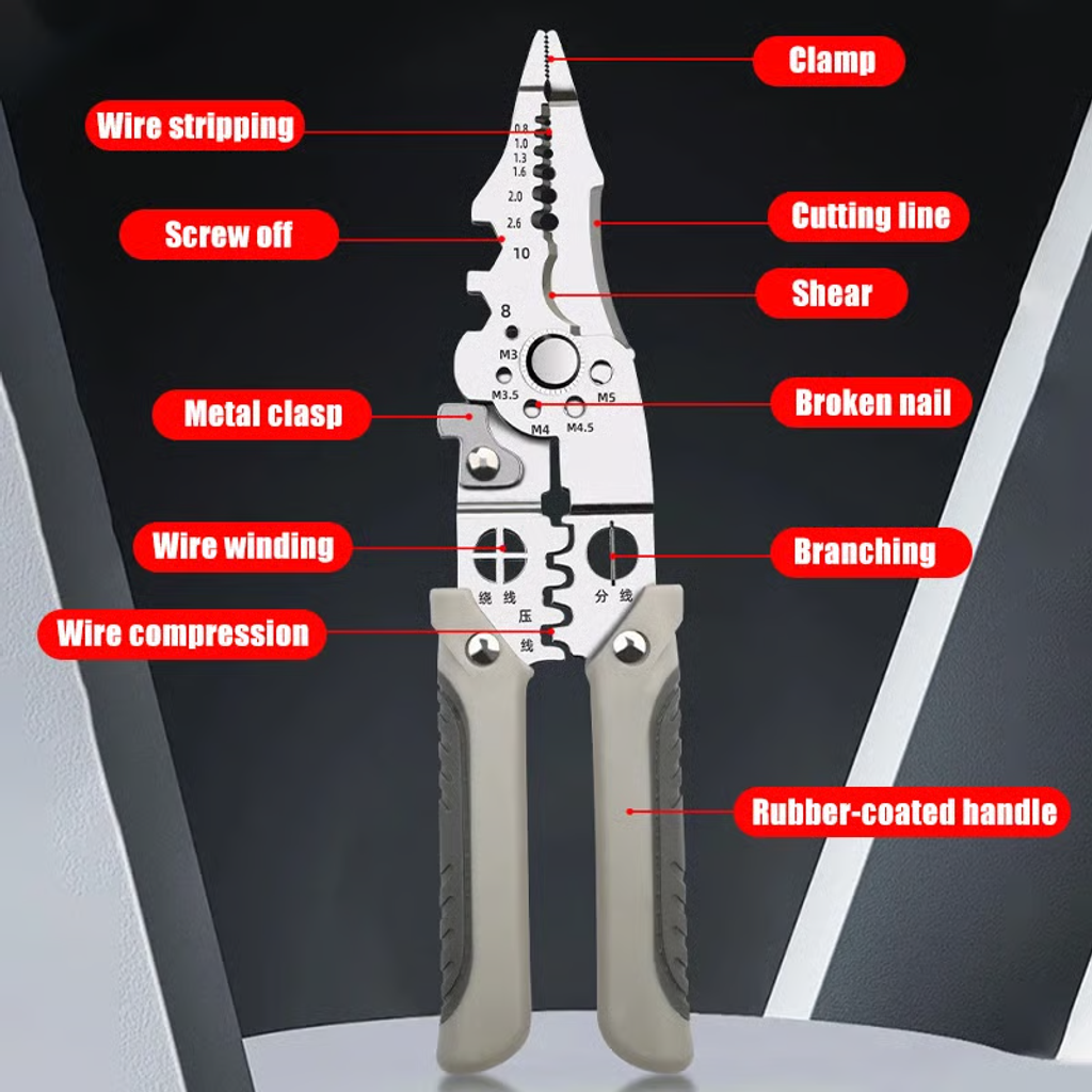 Practical Multi-function Tool meets a variety of electrician operation requirements such as cutting the wire, stripping, crimping, winding, splitting, clamping, and wrenching.